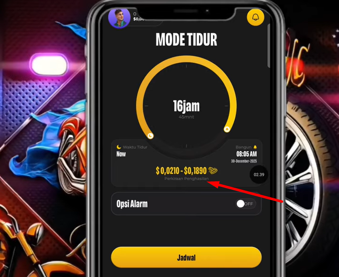 Untuk menghasilkan uang, pengguna harus memulai sesi tidur dengan menentukan durasi alarm. Sistem akan menampilkan perkiraan penghasilan berdasarkan waktu tidur yang dipilih. Semakin lama durasi tidur, semakin besar estimasi saldo yang didapatkan, meskipun jumlahnya tetap terbatas.