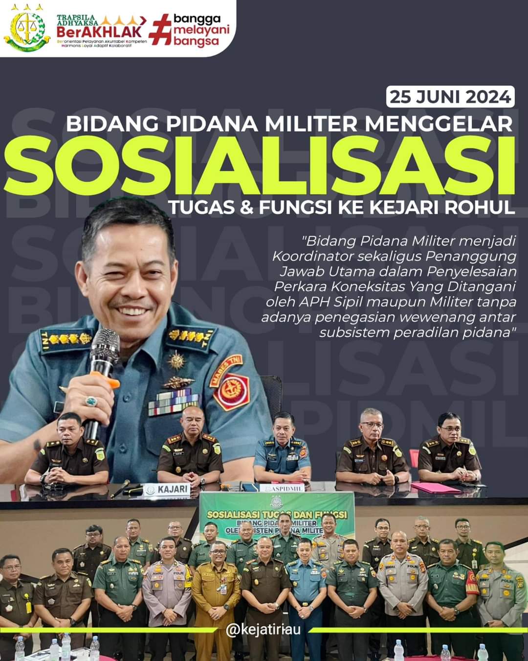 Dalam sosialisasi yang diikuti oleh seluruh APH Sipil & Militer se Wilkum Kabupaten Rohul ini, Aspidmil Kejati Riau Kolonel Laut (H) Faisol, S.H memberikan materi sosialisasi terkait Tugas & Fungsi Bidang Pidana Militer Kejaksaan sebagai Koordinator dan penanggung jawab utama penyelesaian seluruh tindak pidana umum/khusus yang melibatkan yustisiabel sipil dan militer. Dimana pelaksanaan Tusi dini melibatkan seluruh APH baik dari Penyidik Polri maupun Ankum/POM tanpa penegasian antar kewenangan subsistem dalam peradilan pidana.