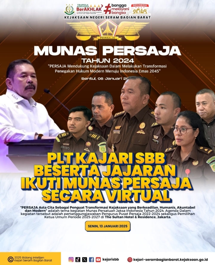 DetikPost.com || Maluku- Senin 13 Januari 2025. Musyawarah Nasional PERSAJA Tahun 2024 dilaksanakan di The Sultan Hotel & Residence Jakarta. Kegiatan tersebut dilaksanakan bersama seluruh jajaran beserta Kepala Kejaksaan Tinggi se-Indonesia. Plt. Kepala Kejaksaan Negeri Seram Bagian Barat Bambang Heripurwanto, S.H., M.H juga bersama jajaran juga mengikuti kegiatan tersebut melalui Zoom Video Conference di Ruang Vidcon Kejari Seram Bagian Barat.