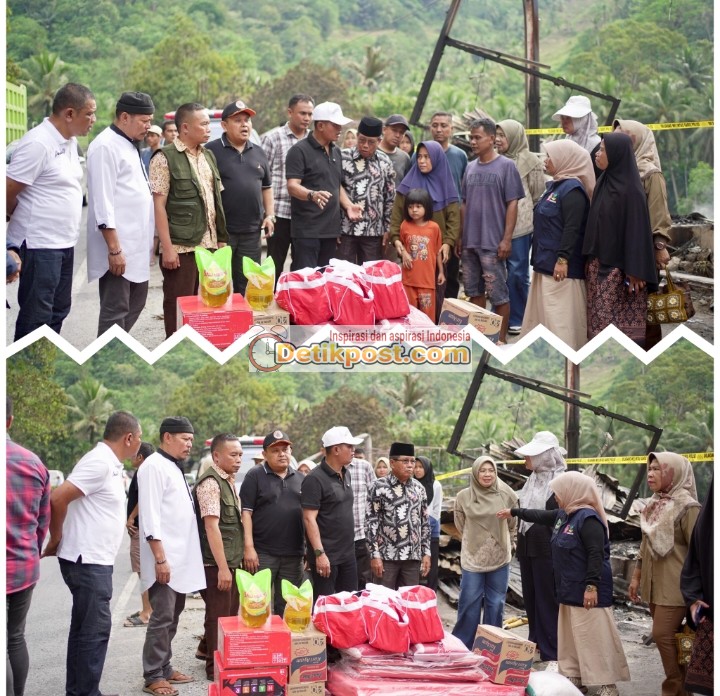 Arosuka Solok_DETIKPOST.COM..///..Bupati Solok Jon Firman Pandu, turun langsung meninjau lokasi kebakaran yang terjadi di Jalan Lintas Sumatera, Nagari Pianggu Kecamatan IX Koto Sungai Lasi pada Sabtu (12/07/2025). Dalam kunjungannya, Bupati menyampaikan ucapan duka dan empati mendalam kepada para korban terdampak musibah tersebut.