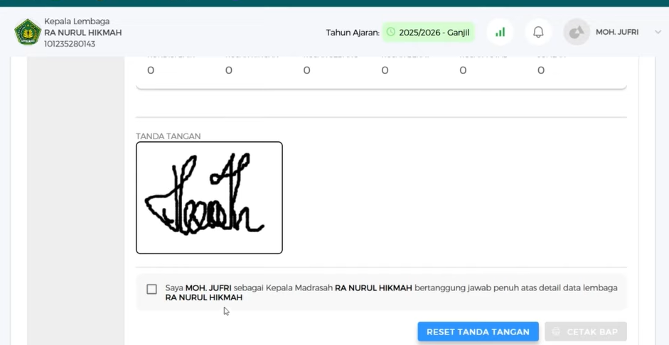 Scroll ke bagian bawah dan centang pernyataan tanggung jawab kepala madrasah.