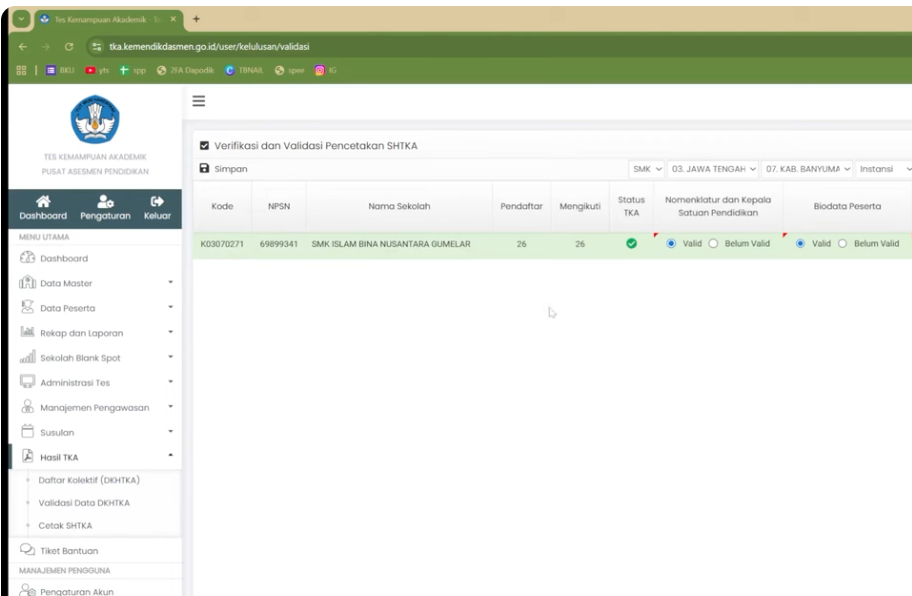 Setelah seluruh data siswa diperbaiki, langkah selanjutnya adalah melakukan validasi DKHTKA. Proses ini menandakan bahwa sekolah telah menyetujui seluruh data dan menyatakan siap untuk tahap berikutnya.