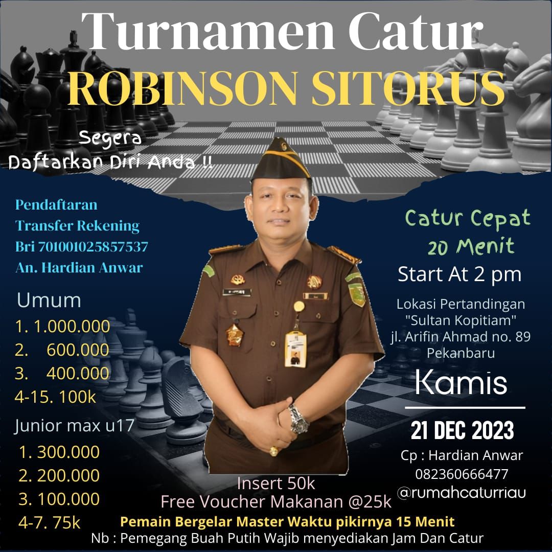 Pekanbaru – Dr. Robinson Sitorus akan menggelar Turnamen Catur Robinson Sitorus di Sultan Kopitiam – Jl. Arifin Ahmad No. 89 Kota Pekanbaru, yang mana Turnamen Catur Robinson Sitorus terbuka untuk umum dan akan dilaksanakan pada hari Kamis tanggal 21 Desember 2023