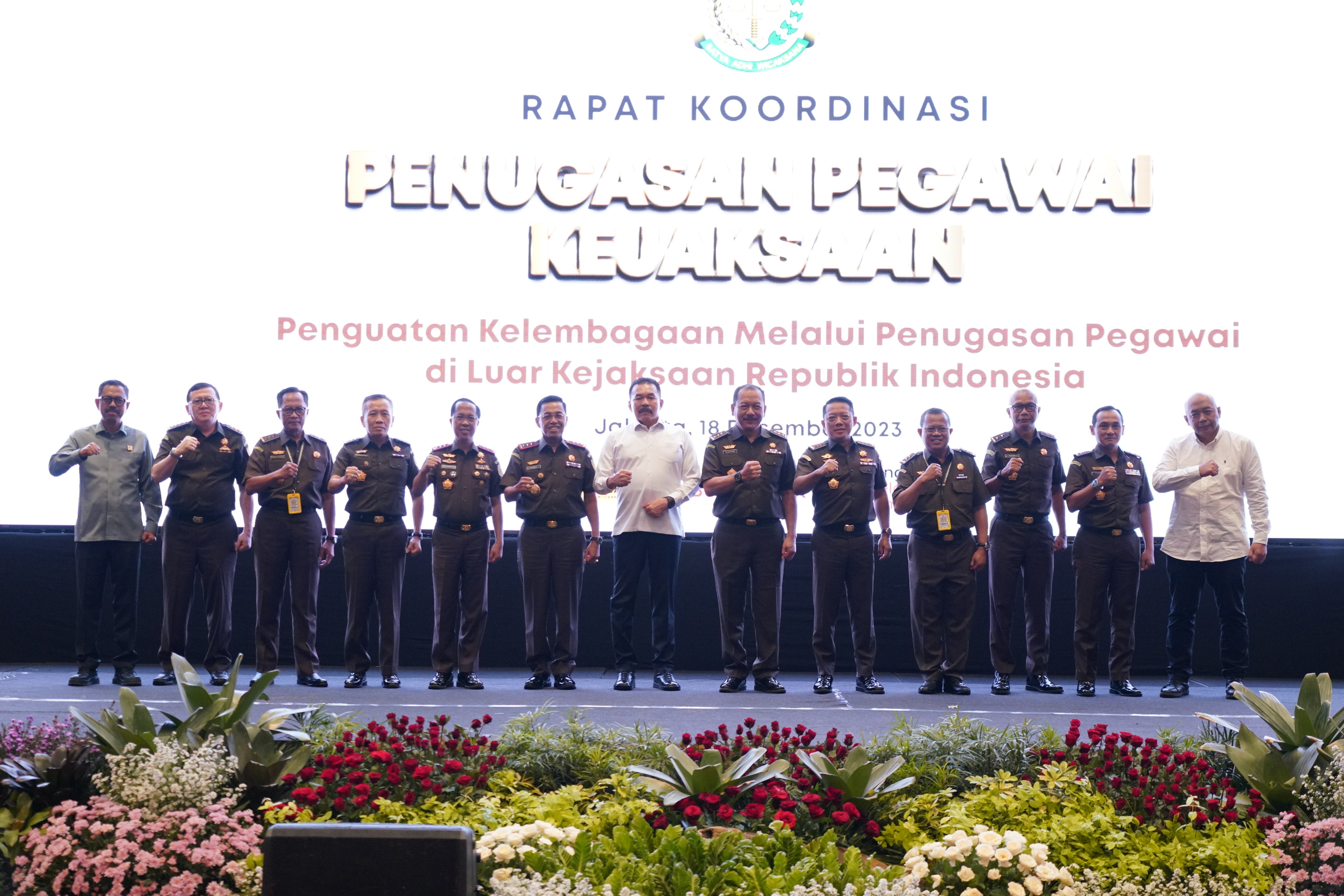 Acara Rapat Koordinasi Pegawai Kejaksaan yang Ditugaskan pada Instansi Pemerintah dan Di Luar Instansi Pemerintah Tahun 2023 dihadiri oleh Wakil Jaksa Agung, Para Jaksa Agung Muda, Kepala Badan Pendidikan dan Pelatihan Kejaksaan RI, Inspektur Jenderal Kementerian Perindustrian RI, Direktur Jenderal Peraturan Perundang-Undangan pada Kementerian Hukum dan HAM RI, perwakilan pejabat Eselon II di Lingkungan Kejaksaan Agung serta para pejabat dan Jaksa yang dikaryakan di luar instansi Kejaksaan.