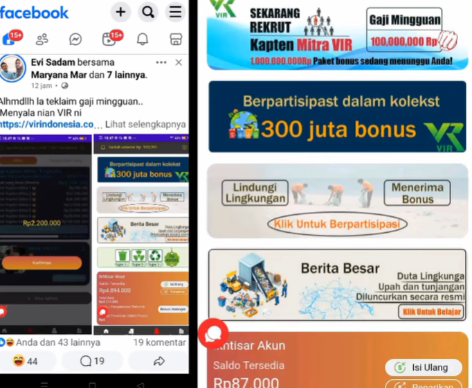 Namun, di balik euforia tersebut, kini mulai muncul kabar kurang menyenangkan. Aplikasi VIR disebut-sebut mulai menunjukkan tanda-tanda scam — alias penipuan berkedok investasi ramah lingkungan. Sejumlah pengguna melaporkan mulai sulit menarik uang, promo yang semakin tidak masuk akal, dan pola bisnis yang menyerupai skema ponzi.