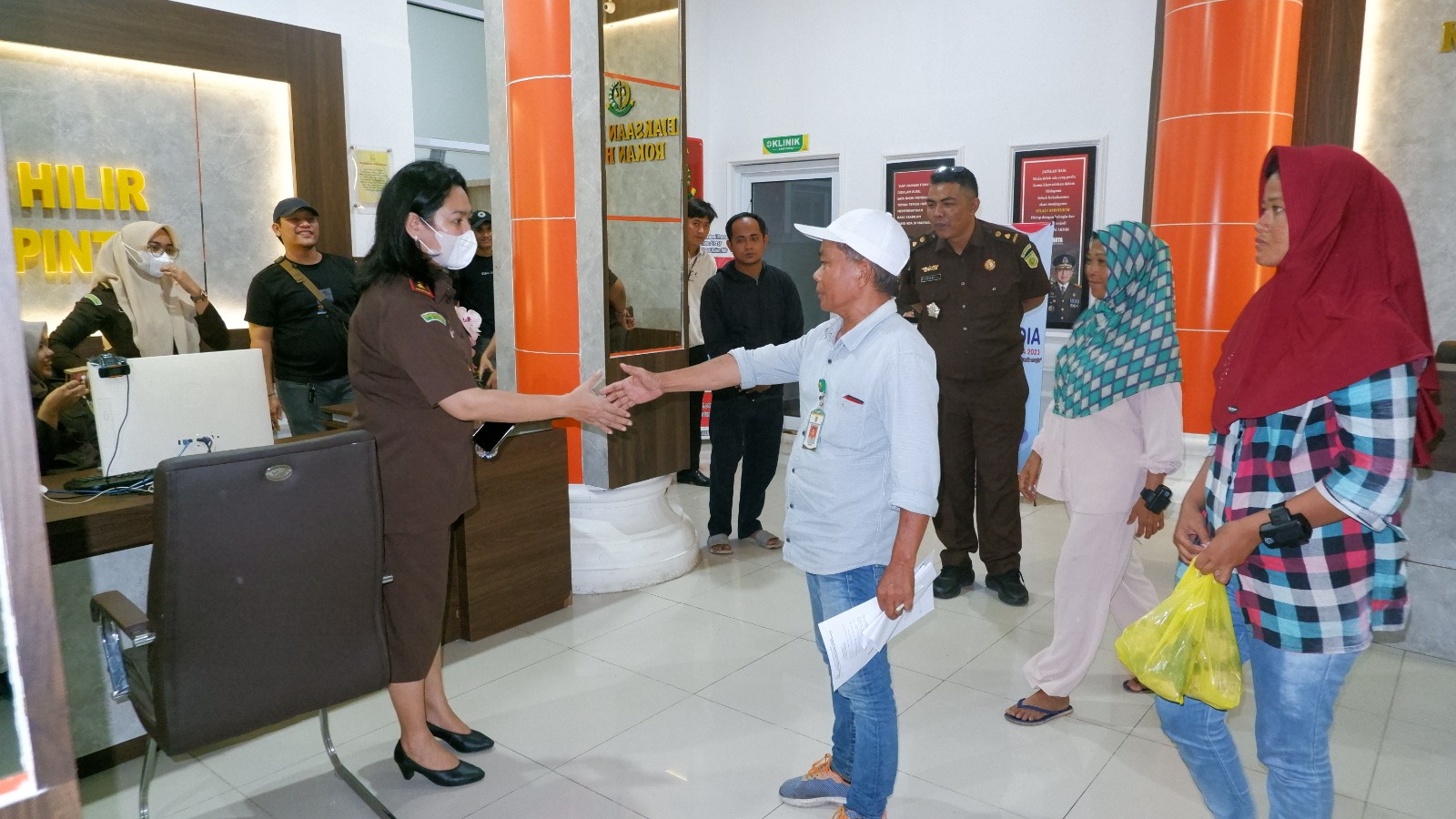 Kajari Rohil Yuliarni Appy SH MH., tampak berjabat tangan dengan Penjamin Terdakwa I dan II (Dok : Kejari Rohil)