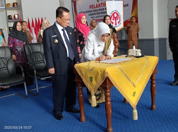 DetikPost.com || Rokan Hilir- Senin 24 Maret 2025. Ketua dewan kerajinan Nasional Daerah (Dekranasda) Provinsi Riau Hj. Henny Sasmita melantik Ketua Dekranasda Kabupaten Rokan Hilir Hj. Basyariah bersama Ketua Dekranasda Kabupaten/Kota lainnya di Provinsi Riau melalui zoom, Senin (24/3/2025).