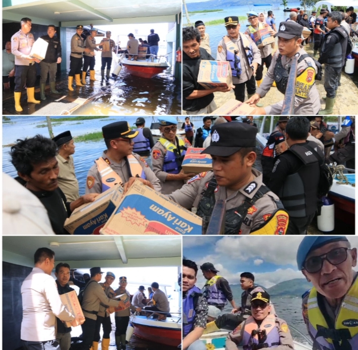 Menggunakan Kapal Boat, Kapolres Solok Kota dan Rombongan Salurkan Bantuan Banjir ke Nagari Muaro Pingai dan Paninggahan lewat Jalur Danau