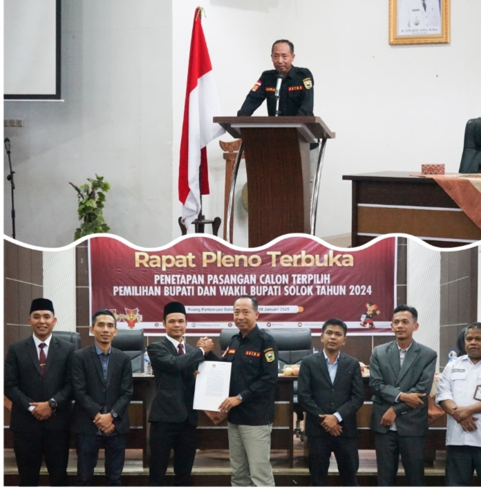 Arosuk Solok-Detkpost.com..ll…Pleno Terbuka Penetapan Pasangan Calon Terpilih Bupati dan Wakil Bupati Solok Berjalan Tertib, Aman dan lancar. Momentum berlangsung pada Kamis, 9 Januari 2025 di Ruang Solok Nan Indah, Arosuka.