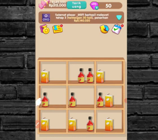 Secara tampilan, Shelf Shuffle Frenzy terlihat seperti game puzzle biasa. Namun perbedaannya terletak pada sistem saldo uang yang selalu muncul di layar.