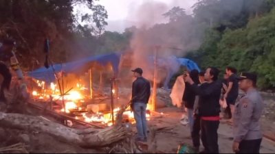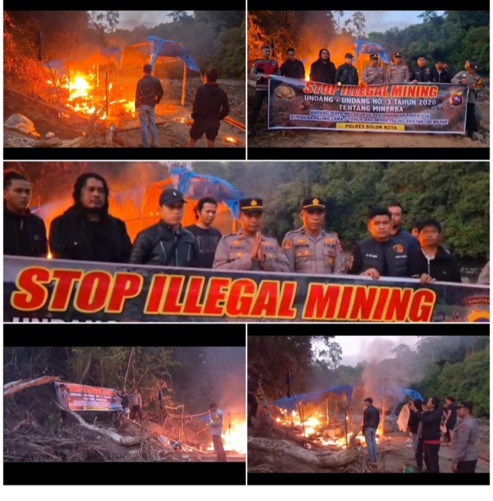 Selanjutnya, terhadap tenda-tenda dan sisa peralatan penambangan lainnya yang tersisa dilokasi , tim dari personil Polres Polres Solok Kota melakukan pemusnahan dengan cara dibakar, dan dilokasi tersebut dipasang spanduk larangan untuk melakukan tambang emas ilegal.
