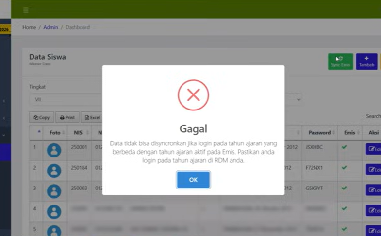 Akibatnya, sistem menolak permintaan sinkron dan menampilkan notifikasi error yang seolah-olah berkaitan dengan tahun ajaran.